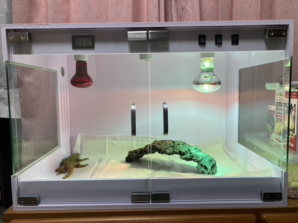 前のケージのドアは磁石だったけど、エキゾテラはロック機能がついてるところがいいと感じた。配線の穴もあったから紫外線ライトのコードも邪魔にならないしとても満足してます!